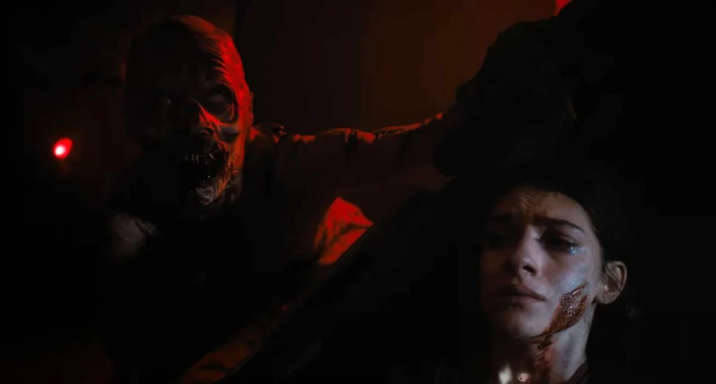 I mentioned the game as having a ‘big goodie bag’ of horror tropes. It manages to juggle a lot of different types of horror and assembles them in one big package that contains everything without feeling over the top. The film is much less subtle but it does try to do a similar thing. Each night the friends die in, they have another thing they have to deal with the next day. That can range from the masked killer they first run into, to a gargantuan creature towering over their escape route. It is quite messy but in probably the best way. Although not subtel at all, this film is a true celebration of horror as a genre and feels like a horror theme park at points. There is one excellent scene where they are looking through a character’s phone to see what they have recorded that they have forgotten in the days passed. Here, we are gifted a montage of some excellent short horror scenes, some of which were genuinely quite freakish. Whilst it tried to do this throughout the film, there needed to be more of the cool stuff that was on that phone. If you are going to do theme park horror, fully commit to it because even if it might be messy, by god is it entertaining.